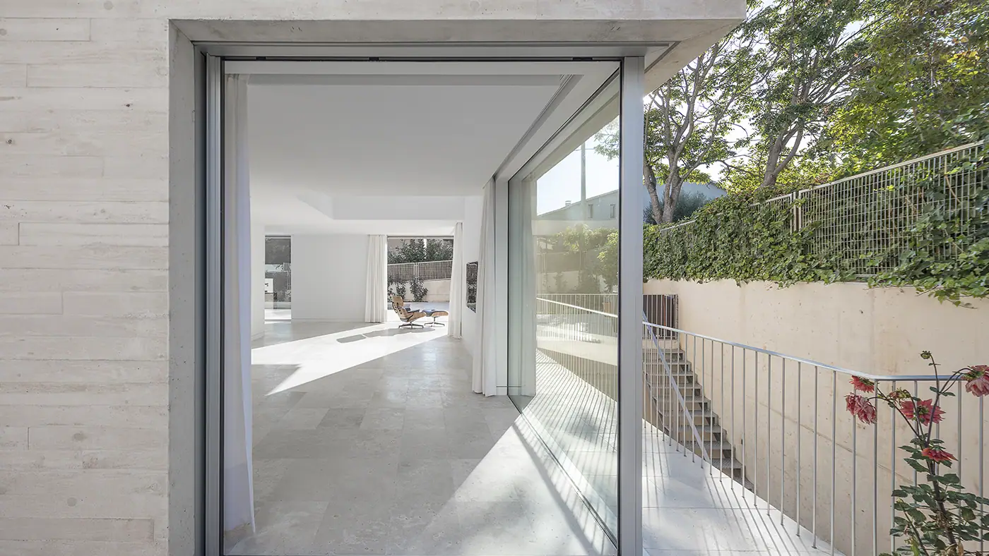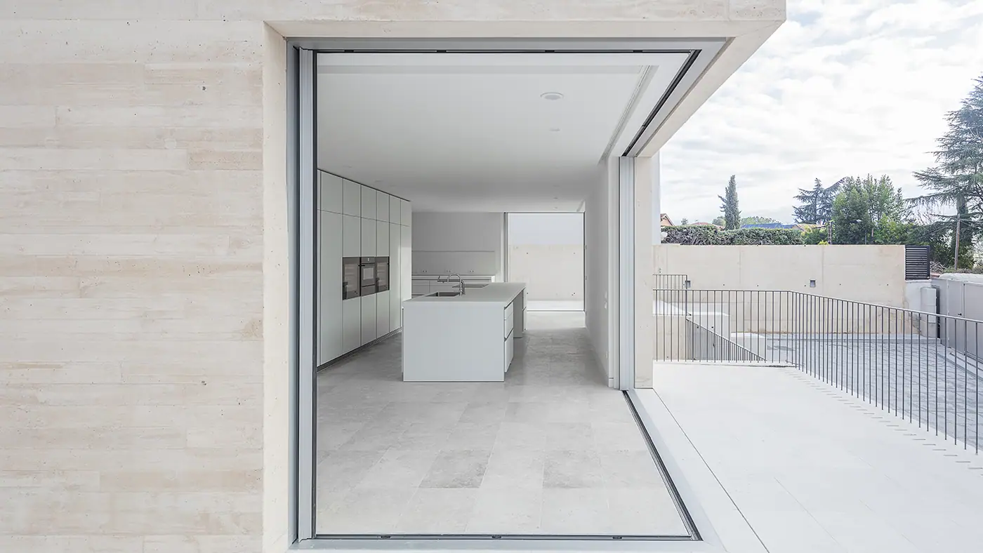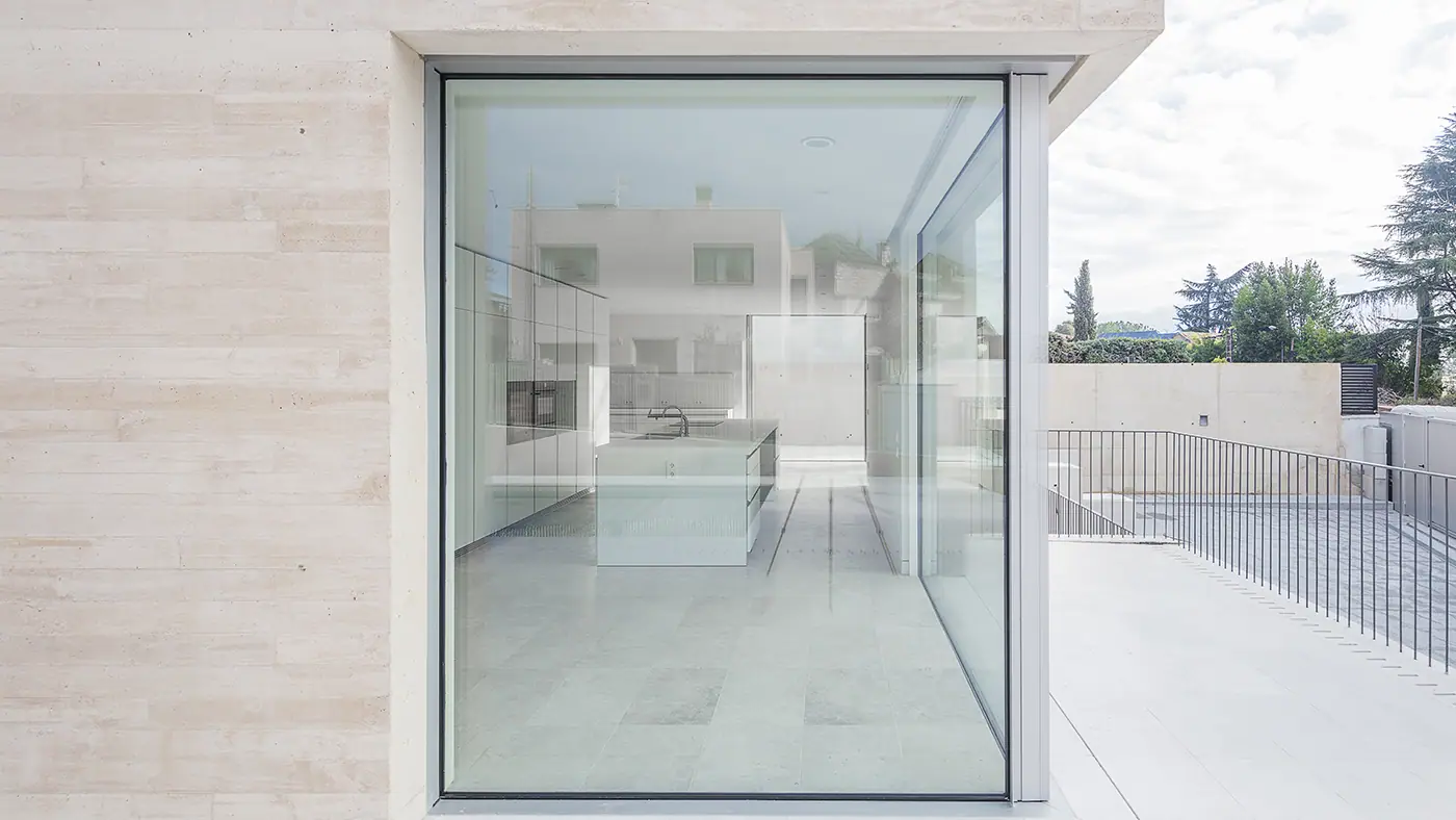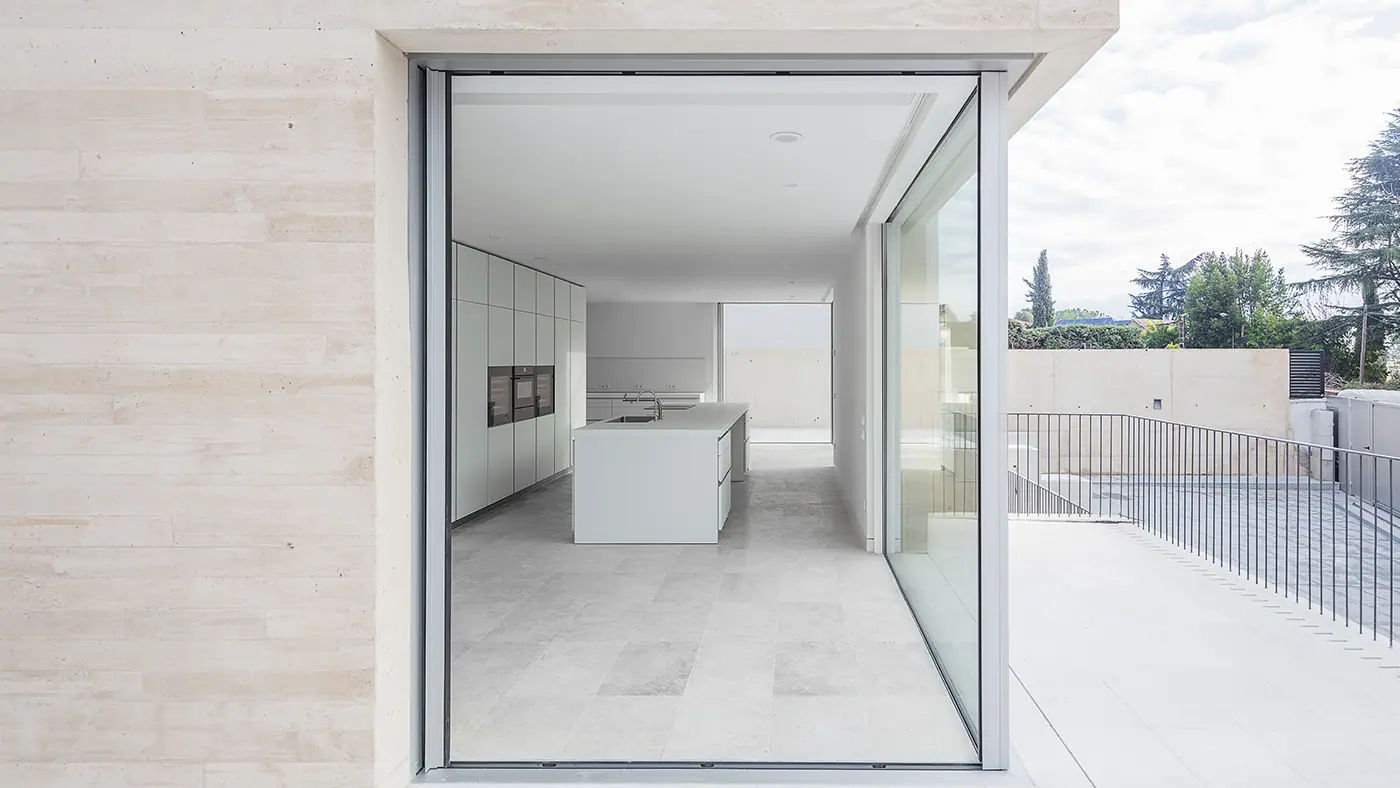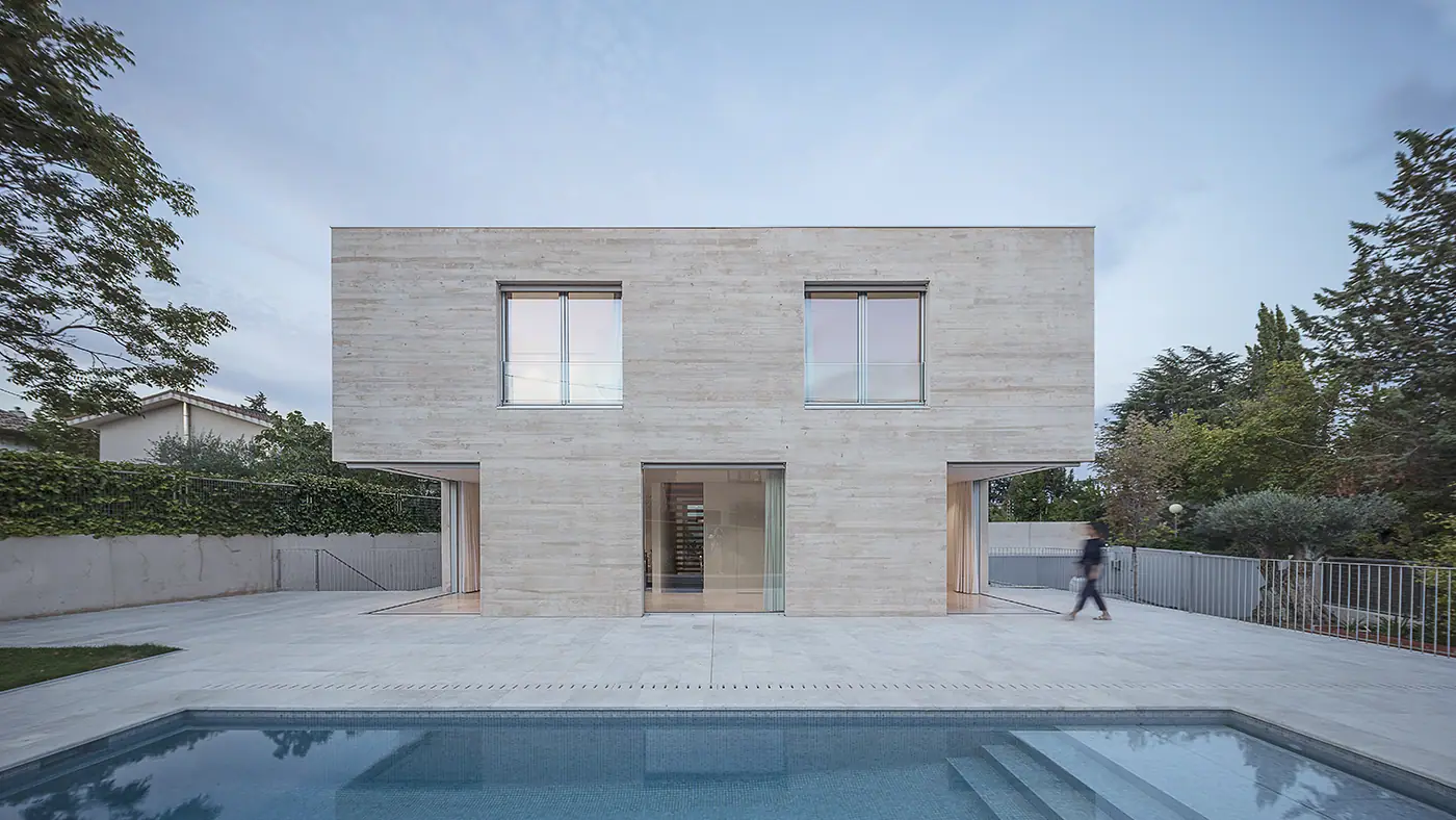 La construcción de la estructura se realiza en hormigón blanco con encofrado de tablilla de madera, posibilitando los cuatro grandes voladizos de las cuatro esquinas en planta baja. El interior y exterior se diluyen gracias a un pavimento continuo de piedra caliza de Campaspero que extiende las cuatro esquinas abiertas de la vivienda hacia las diagonales de la parcela, generando así́ una mayor amplitud visual. Un núcleo central alberga la escalera, el ascensor y las instalaciones que recorren las tres plantas de la vivienda. En criterios de sostenibilidad, las placas solares alimentan energéticamente el consumo de la aerotermia de la vivienda, concebida como una construcción de consumo cero.