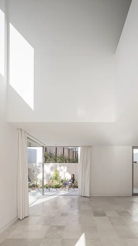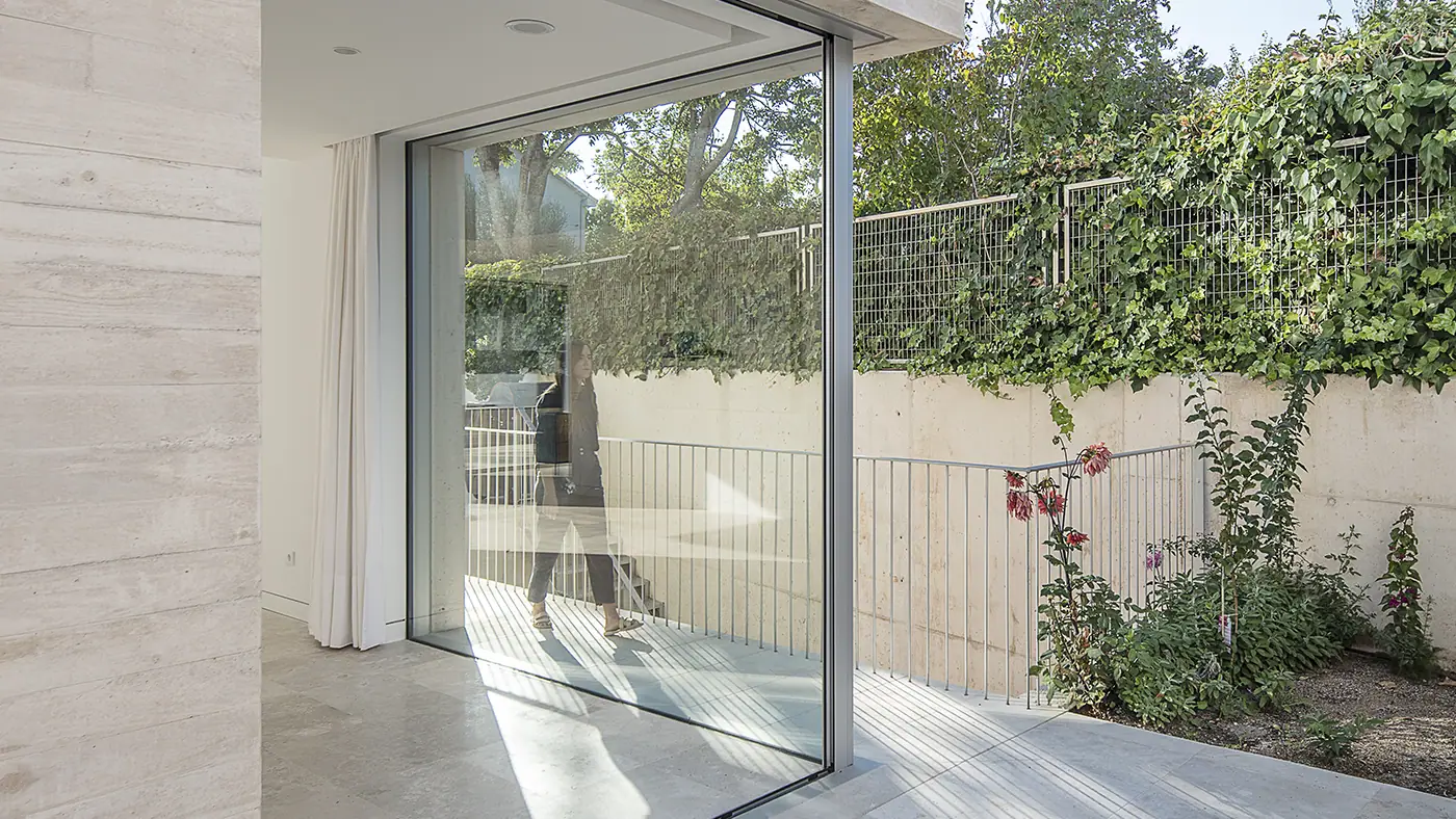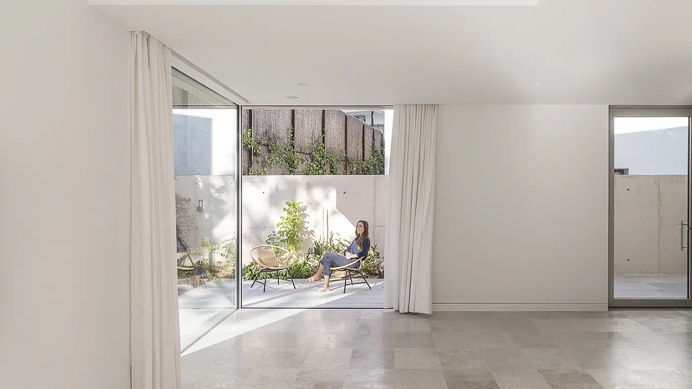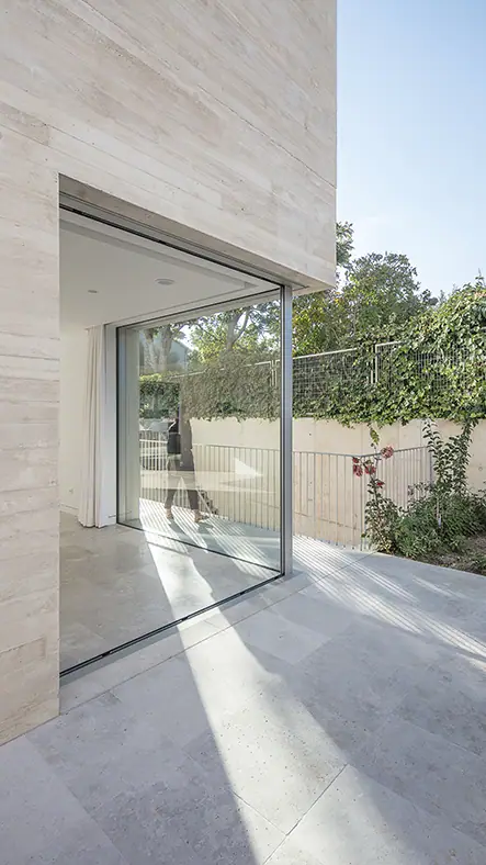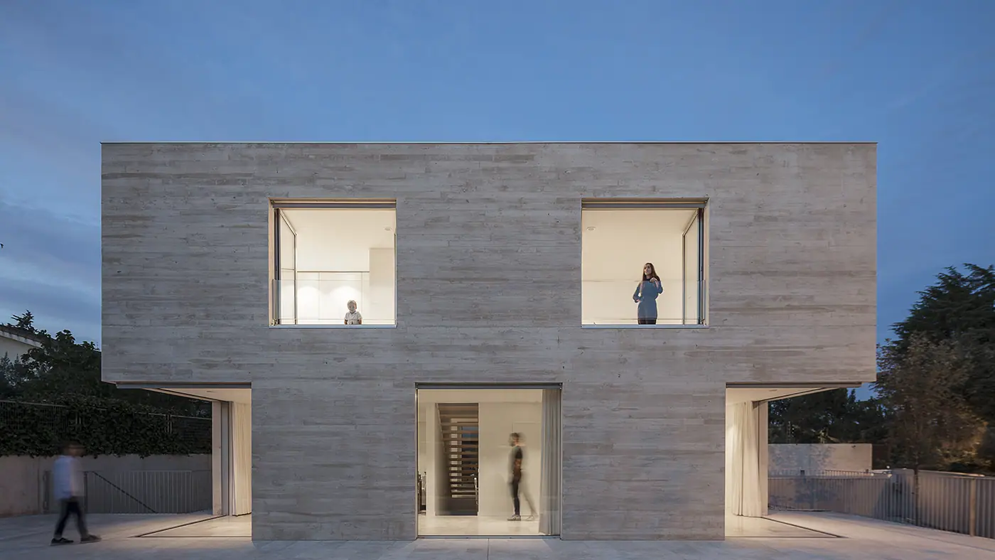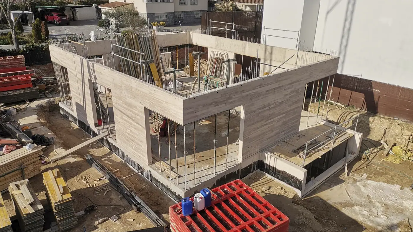 La construcción de la estructura se realiza en hormigón blanco con encofrado de tablilla de madera, posibilitando los cuatro grandes voladizos de las cuatro esquinas en planta baja. El interior y exterior se diluyen gracias a un pavimento continuo de piedra caliza de Campaspero que extiende las cuatro esquinas abiertas de la vivienda hacia las diagonales de la parcela, generando así́ una mayor amplitud visual. Un núcleo central alberga la escalera, el ascensor y las instalaciones que recorren las tres plantas de la vivienda. En criterios de sostenibilidad, las placas solares alimentan energéticamente el consumo de la aerotermia de la vivienda, concebida como una construcción de consumo cero.